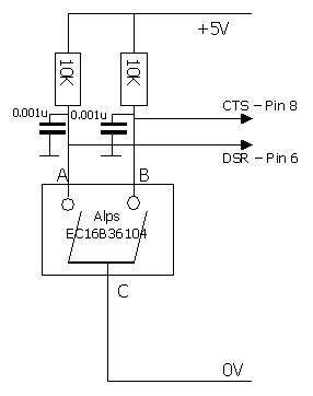 The circuit should work with most PCs, however for proper RS232 compliance one should really attach the common pin, ie "C" to -5V, so that the CTS and DSR signals swing at least +5V to -5V (+12 to -12V) would be even better, but as I said, every PC RS232 i/f I've tried works fine with just 0 & 5V. If you do wire "C" to -5V change the resistors to 22K, and if you use +12V & -12V, then change the resistors to 47K or 56K, the current thru. the encoder switches should be kept below 0.5mA. PROBLEMS ?